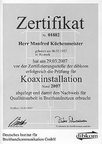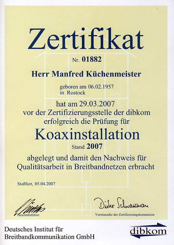- Planung und Realisierung von Satellitenempfangs- und Breitbandverteilanlagen gemäß den Richtlinien des Deutschen Instituts für Breitbandkommunikation GmbH (dibkom)